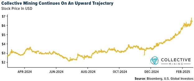 - Collective Mining Ltd. reported its best drill intersection at the Apollo system this week, with drill hole APC104-D5 intersecting 106.35 meters at 9.06 g/t gold equivalent (AuEq) within 497.35 meters at 3.01 g/t AuEq, highlighting the potential for high-grade sub-zones that could enhance the project’s overall grade and size. This breakthrough underscores Collective’s ability to unlock significant value at Guayabales, reinforcing its position in the gold exploration sector.