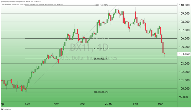 The dollar index, which measures the greenback against a basket of major trading partner currencies, opened Monday at 107.345 before beginning its steep descent. By Tuesday's close, the index had fallen to 105.51, reflecting a daily decline of 0.91%. Wednesday saw the most severe drop, with the index plummeting 1.18% to 104.205. Through midweek, the cumulative loss reached an alarming 3.14%. Today’s decline in the U.S. dollar index was only fractional with the index falling to 104.16 after factoring in today’s decline of -0.11%.
