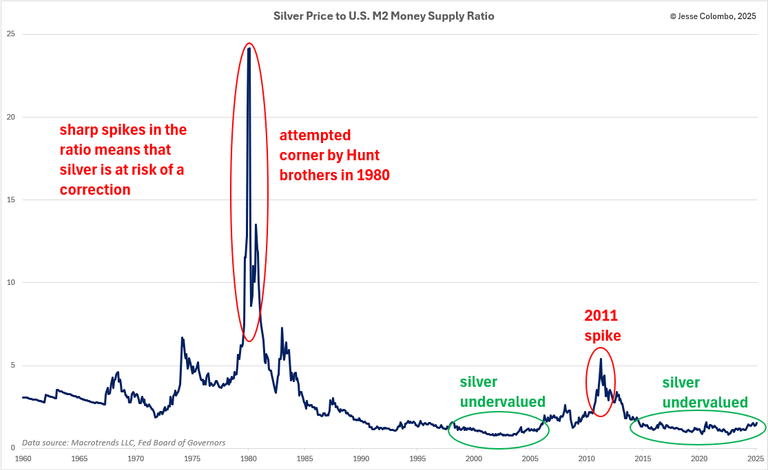 Another way to assess whether silver is undervalued or overvalued is by comparing it to various money supply measures. The chart below shows the ratio of silver's price to the U.S. M2 money supply, providing insight into whether silver is keeping pace with, outpacing, or lagging behind money supply growth. If silver's price significantly outpaces money supply growth, the likelihood of a strong correction increases. Conversely, if silver lags behind money supply growth, it suggests a potential period of strength ahead. Since the mid-2010s, silver has slightly lagged behind M2 growth, which, combined with other factors discussed in this piece, position it for a strong rally.