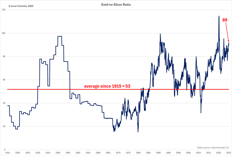 The long-term gold-to-silver ratio chart clearly shows that silver is significantly undervalued relative to gold, suggesting that silver has substantial upside potential. As silver rises to close this gap, the ratio would decline. The current gold-to-silver ratio stands at 89, but if it were to revert to its historical average of 53 since 1915—without any increase in gold's price—silver would be valued at a solid $55 per ounce (as compared to the current price of $32.65).