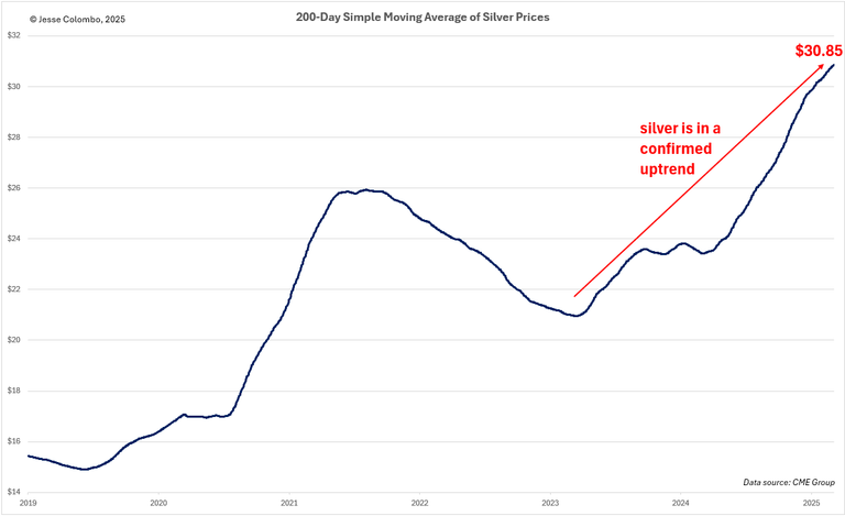 Although silver has traded in a choppy, erratic manner for much of the past year, it is in a confirmed uptrend, despite grinding higher in a frustrating "two steps forward, one step back" manner. This is evident in the 200-day simple moving average, a helpful tool for identifying an asset's primary trend by filtering out short-term price fluctuations.