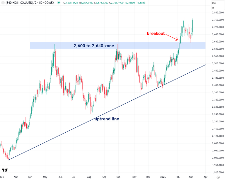 In addition to gold, copper is another key metal that strongly influences silver's price, as I explained here. This understanding led me to develop the Synthetic Silver Price Index (SSPI)—an indicator designed to validate silver's price movements and filter out potential fakeouts. The SSPI is calculated as the average price of gold and copper, with copper adjusted by a factor of 540 to ensure gold doesn't disproportionately impact the index. Remarkably, despite silver not being an input, the SSPI closely mirrors silver's price movements.