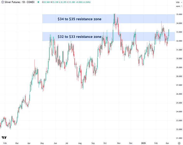 The first key sign that silver is ready to surge is its decisive move above the $32 to $33 resistance zone, which has acted as a stubborn ceiling for much of the past year. This breakout is an encouraging signal, but the next crucial confirmation will be a strong, high-volume close above the $34 to $35 resistance zone—the same level that halted the late-October rally in its tracks. Once silver clears both barriers, the path should be wide open for the powerful bull market I've anticipated since April 2024. However, for this breakout to remain valid, silver must close and hold above both resistance zones; otherwise, all bets are off.