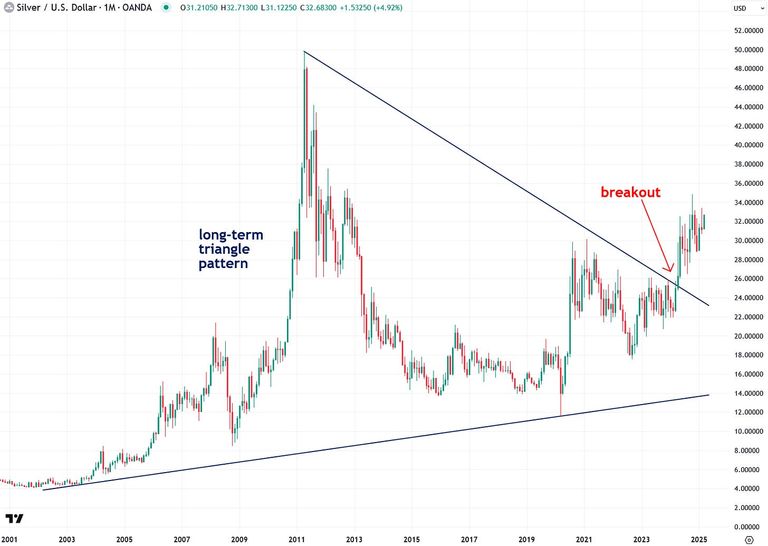 Another strong indication that silver is on the verge of a powerful bull market is its breakout in April 2024 from a two-decade-long triangle pattern—a development I highlighted in my bullish thesis published in a widely read ZeroHedge article at the time: