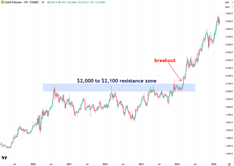 Also, take a look at the chart below and notice how gold struggled from 2020 to early 2024 to break above the $2,000–$2,100 resistance zone, which acted as a price ceiling for much of that period. Despite multiple attempts, gold was repeatedly pushed back down. However, in March 2024, it finally broke out, igniting the powerful bull market we see today. I see striking parallels with silver's $32–$33 resistance zone over the past year and believe that once silver manages to close above this level, it will soar just as gold did.