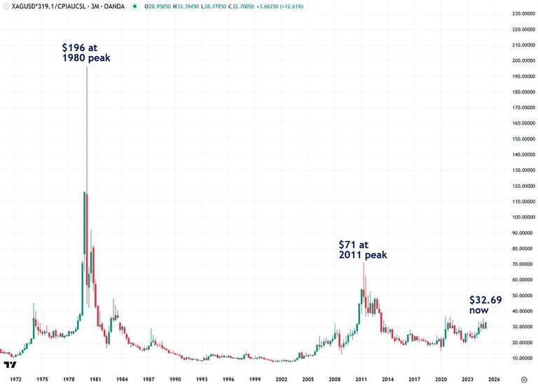 Adjusting silver's price for inflation further highlights how undervalued it is by historical standards. During the Hunt brothers-induced spike in 1980, silver reached an inflation-adjusted price of $196. In the 2011 bull market, driven by quantitative easing, it hit $71. Currently trading at just $32.69, silver has significant room to rise if it's to catch up with these previous inflation-adjusted peaks.