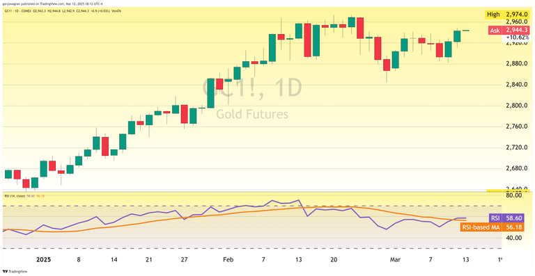 Gold prices climbed today driven by safe-haven buying as President Trump's 25% tariffs on steel and aluminum took effect. The precious metal advanced despite February's Consumer Price Index showing inflation rising less than expected at the slowest pace in four months. April gold futures increased by $20.60 (0.70%) to close at $2,943.40, marking the second significant daily gain this week.