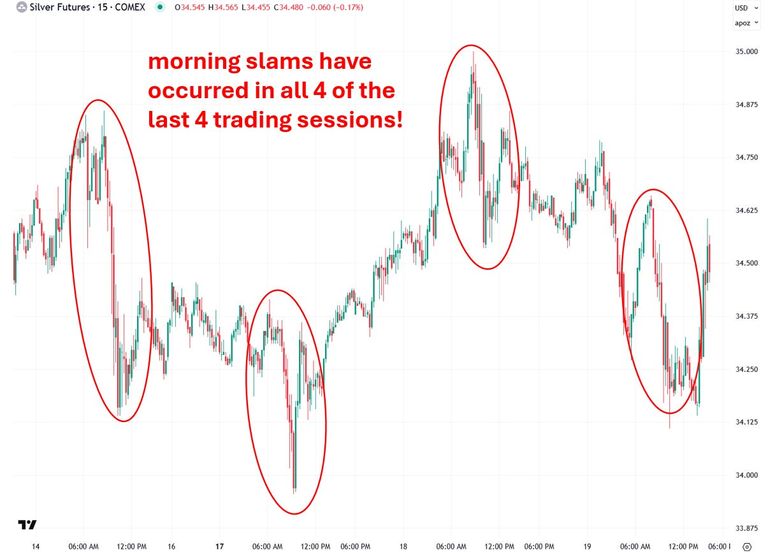 Some of the most aggressive slams tend to occur on Friday mornings during the U.S. trading session. With the Asian and European markets closed, trading volume and liquidity are significantly lower, creating the perfect conditions for bullion banks to manipulate silver's price with minimal resistance. This lack of market depth allows them to maximize their impact, giving them more "bang for their buck" when executing price suppression tactics.