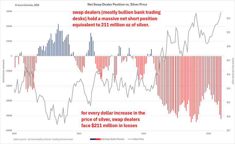 If the buying pressure is strong enough, it could even lead to a short squeeze, dramatically amplifying silver's upward momentum. Given the sheer size of their short position, bullion banks stand to lose approximately $211 million for every $1 increase in silver's price—a setup for a major price surge. Now, imagine what happens if silver climbs by $5, $10, $20, or more from this point.