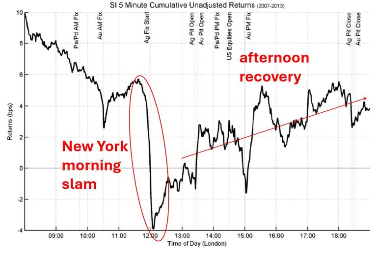 Interestingly, Gold Charts R Us—a leading provider of precious metals data—analyzed and averaged every silver futures trading session from 2007 to 2013. Their findings revealed a clear and consistent pattern: sharp price slams during the New York morning session, followed by recoveries in the afternoon and overnight as the Asian and European markets open. This exact pattern is clearly visible in the chart, and unfortunately, the same phenomenon continues in 2025.