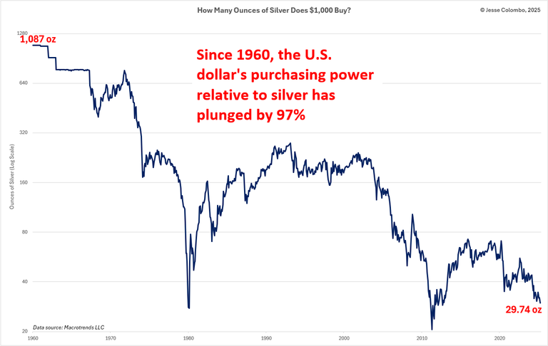 While the supply of dollars has surged and continues to expand, silver has consistently preserved its purchasing power. The compelling chart below illustrates how the purchasing power of $1,000 in silver ounces has changed over time. In 1960, $1,000 could buy 1,087 ounces of silver, but today, it purchases only 29.74 ounces—a staggering 97% decline in the dollar's purchasing power relative to silver. This means that the same amount of silver in 1960 could buy roughly the same quantity of goods and services then as it does today, whereas the dollar has lost significant value. That's a powerful reason to consider storing wealth in physical silver.