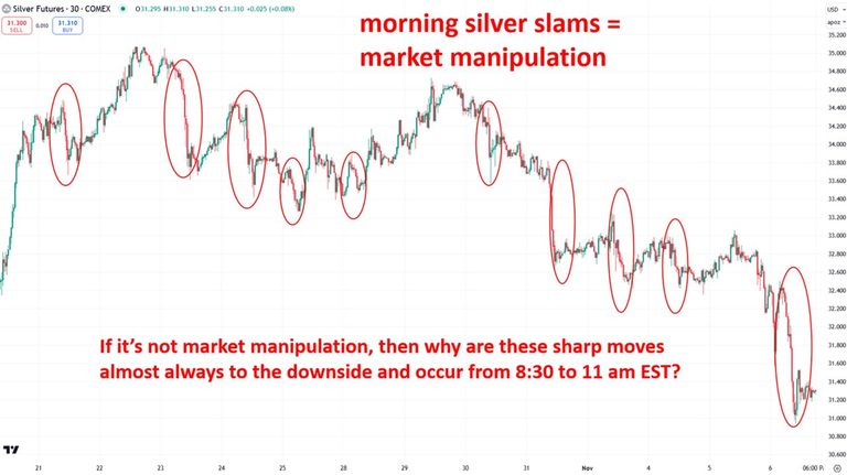The chart below shows another egregious example of the manipulation slam pattern, captured on the intraday silver futures chart from late October to early November. During this period, silver made a strong breakout attempt, reaching as high as $35 per ounce, only to be aggressively slammed lower nearly every morning between 8:30 AM and 11:00 AM EST. The heavy selling pressure during the U.S. trading session repeatedly drove silver's price back down, putting the kibosh on the widely watched late October breakout attempt.