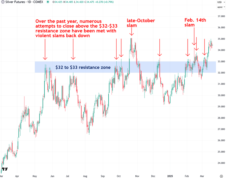 Silver's price action over the past year serves as a textbook example of how silver tamping works. As the chart below illustrates, silver has repeatedly attempted to break above the $32–$33 resistance zone, only to be slammed back down each time—except for the current breakout attempt (the outcome of which remains uncertain).