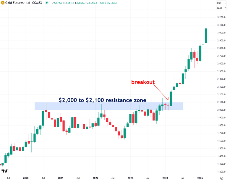 Also, take a look at the chart below and notice how gold struggled from 2020 to early 2024 to break above the $2,000–$2,100 resistance zone, which acted as a price ceiling for much of that period. Despite multiple attempts, gold was repeatedly pushed back down. However, in March 2024, it finally broke out, igniting the powerful bull market we see today. I see striking parallels with silver's $32–$33 resistance zone over the past year and believe that once silver manages to close above this level, it will soar just as gold did.