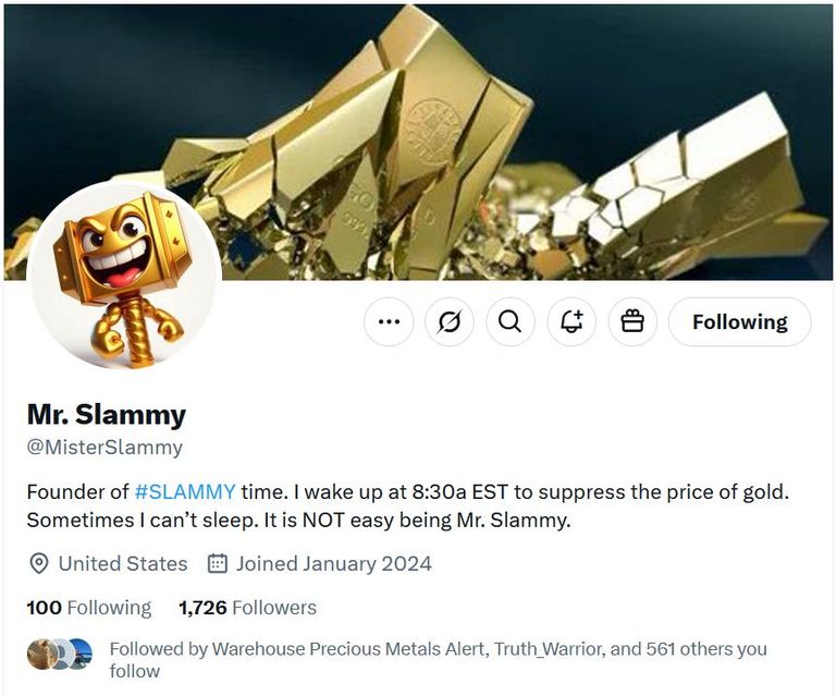 Adding to the humor, there is even a parody account on X impersonating Mr. Slammy, playfully teasing and tormenting precious metals investors whenever gold and silver surge higher. When the metals inevitably get slammed back down, the account takes mock victory laps, celebrating the suppression.