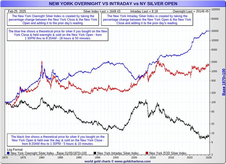 In stark contrast, the New York Overnight Silver Index, represented by the blue line on the chart, tracks the theoretical price of silver if one were to buy at the New York close in the afternoon and sell at the New York open the following morning. Starting from a base of 100 in 1970, this index has skyrocketed to over 20,000 by February 2025—an astonishing gain of 19,900%.