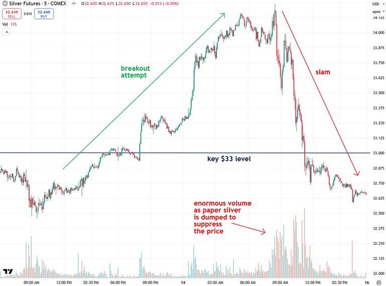 However, around 9 AM New York time, as the U.S. trading session got underway, a massive flood of "paper" silver—in the form of futures contracts—was suddenly dumped onto the market. This deliberate maneuver drove silver back below the critical $33 level, halting the breakout in its tracks and demoralizing silver investors once again.