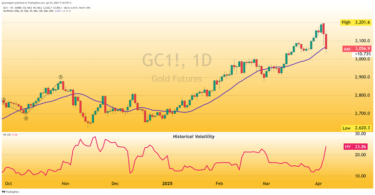 The S&P 500 has suffered a record two-day decline, with companies losing over $4 trillion in market capitalization—exceeding the $3.3 trillion loss recorded during March 2020. Gold futures fell dramatically, with the most active June contract dropping $52 yesterday and an additional $80 today, settling at $3,056—a 4.25% decline since Trump's announcement.