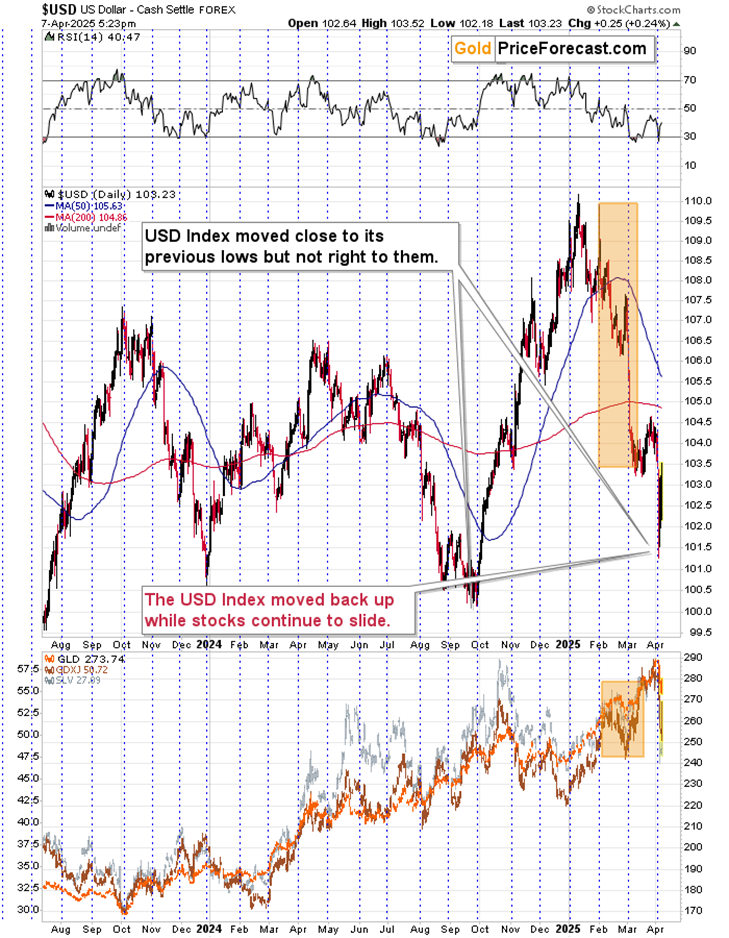 Precisely, I wrote about it on April 3 after both: stocks and the USD Index plunged. In addition to the above, we saw huge declines in: crude oil, copper, silver, and even gold.