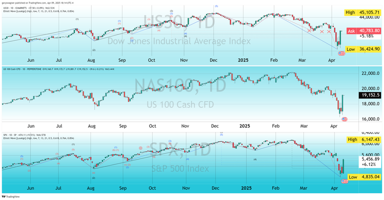 U.S. equity markets experienced even more dramatic gains. The Dow Jones Industrial Average surged by 2,900 points, while the S&P 500 posted its largest single-day percentage gain since 2008, rising 9.52% to close at 5,456.90. The tech-heavy NASDAQ Composite outperformed both indices with an extraordinary 12.16% gain.