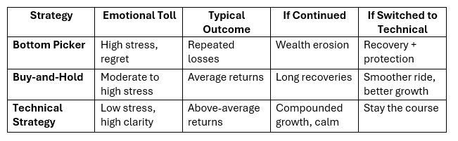 They'll avoid major bear market pain, grow wealth steadily, and maintain peace of mind. Over time, compounding consistent gains with minimal drawdowns outperforms both bottom pickers and most buy-and-hold portfolios — especially when the next bear market inevitably hits. Or is this you?