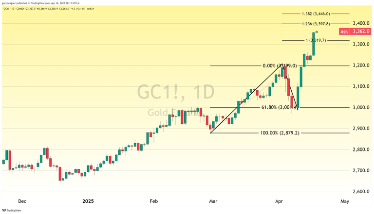 The most active gold futures contract (June 2025) gained approximately $256 over Wednesday, Thursday, and Friday of last week—an impressive feat considering it followed a $195 price decline that concluded on Monday, April 7. In just three trading days, gold not only recovered these losses but established a new all-time record high of $3,254.90.