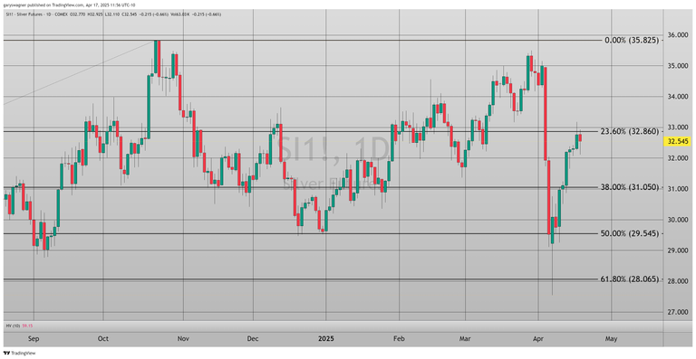 Silver prices also retreated, with the most active May contract falling $0.435 (1.33%) to $32.54. Despite this pullback, the semi-precious metal, which finds significant use in industrial applications, has posted respectable gains over the past nine trading days. Since April 7, when it opened at $29.23, silver has appreciated just over 10% in value. However, silver has clearly underperformed compared to gold, resulting in the gold-silver ratio increasing from 99.24 on April 7 to its current level of 102.151—a ratio not seen since mid-May 2020.