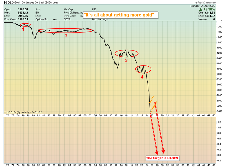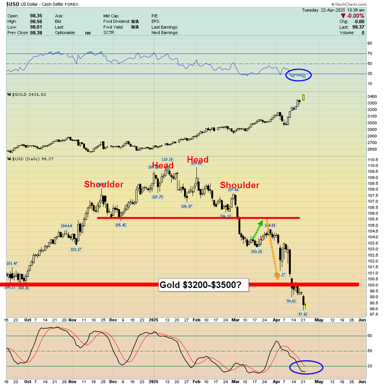 Months ago, I suggested that the USDX (dollar index) was poised to plummet to par, and it would be accompanied with $3200-$3500 gold.
