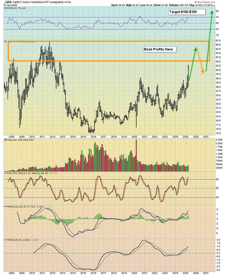 - The $55-$67 area is significant resistance, but what is likely to occur is more of a pause than a crash… followed by a surge to the $100-$120 target zone highs.