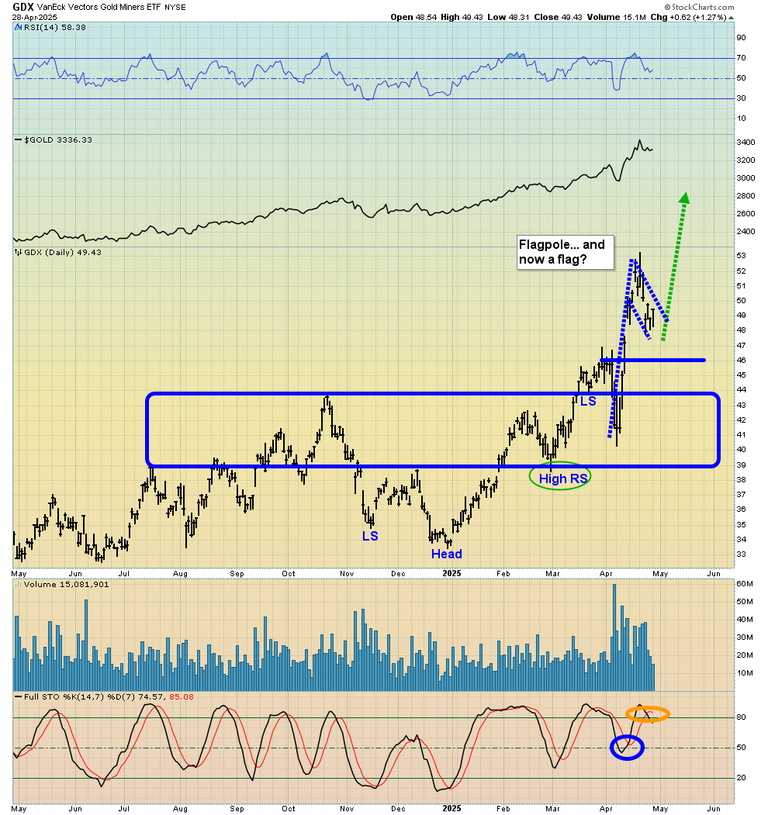 For a look at the GDX daily chart. The bottom line is that gold looks soft in the short term, silver looks good, and the miners look great!