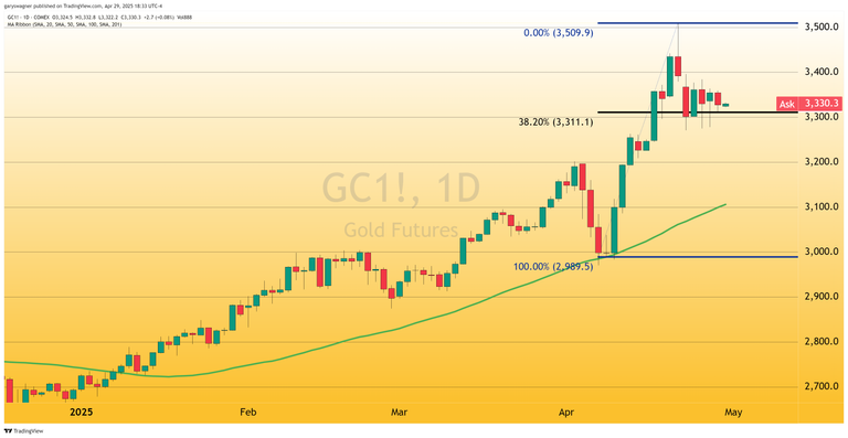 Gold futures have maintained a position above the key $3,300 support level despite recent price consolidation. After reaching a record high of $3,509.90 on April 22, the June futures contract has established a narrowing trading range over five consecutive trading sessions.