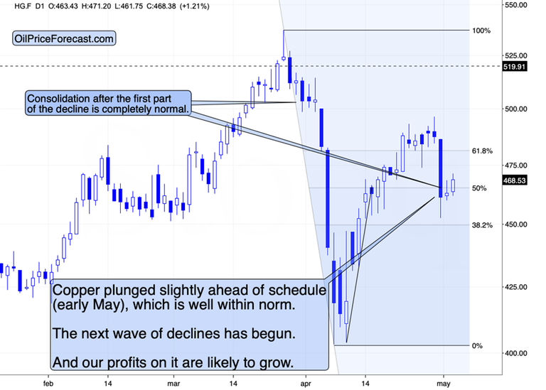 In the previous weeks, I wrote a lot about the links between now and 2008. While the history rhymes instead of being repeated to the letter, but sometimes the market does repeat its performance on important anniversaries. And please note that the final top in copper in 2008 was formed on May 5. If this was to be repeated, we’d be looking for the final top to take place on the next trading session – on Monday.