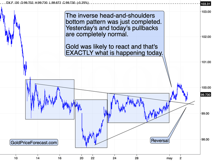This pullback is completely natural, as the USDX just completed its inverse head-and-shoulders pattern. Corrections after those are common. And since the USDX just bottomed very close to the triangle-vertex-based reversal, it seems that the bottom here is in or about to be in.