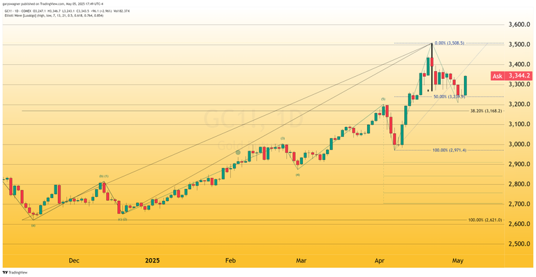 The precious metal soared 2.89% ($94.20) to settle at $3,341.30 per troy ounce for the most active June futures contract, recovering from an early intraday low of $3,243.50 to approach the day's high of $3,346.70. This impressive single-day rally not only recovered last week's 2.49% decline but surpassed it.