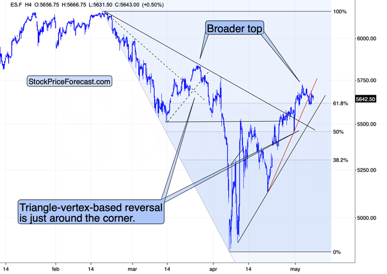 Based on that reversal AND the breakdown below the very short-term, rising, red support line (which was just verified), it seems that the move above the 61.8% Fibonacci retracement will be invalidated shortly. This, in turn, means that the stock market might have just ended its corrective upswing.