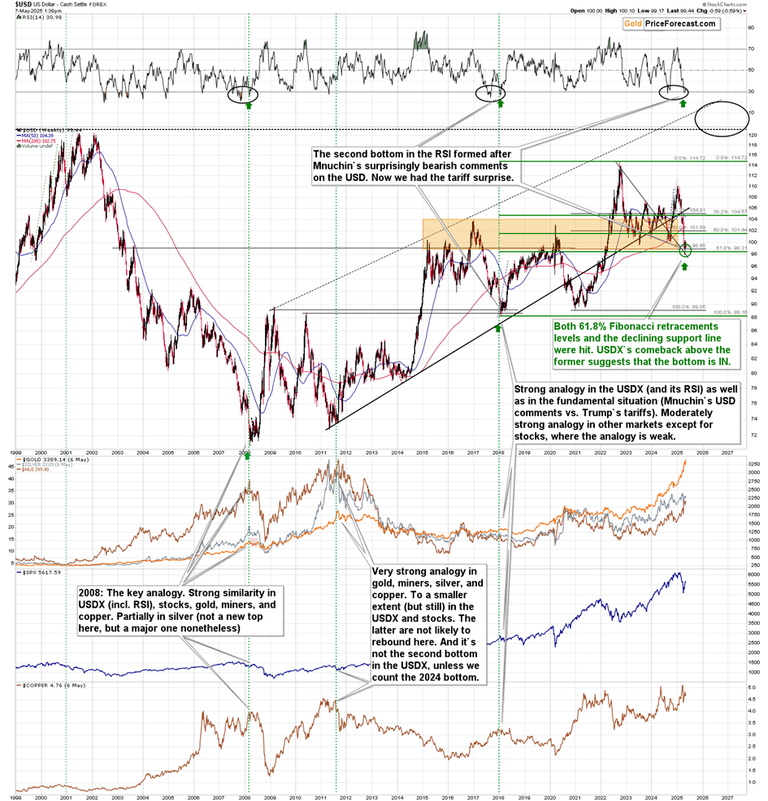 What’s even more remarkable is that both bottoms – the current one and the 2018 one – formed when politicians (Mnuchin then, Trump now) said things that were particularly bearish for the USDX or at least that were viewed as such by the markets (the tariffs are fundamentally bullish for the USDX, even though markets’ emotional reaction was as if the opposite was the case). The latter (a price decline while the fundamentals improved) is a great reason to think that the USD Index is going to move higher in the medium term.