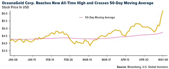 - OceanaGold hit an all-time high, surging 13% to C$5.73, as momentum builds following a standout first quarter marked by strong earnings, zero debt, and $312 million in trailing 12-month free cash flow. The company’s performance and growth outlook have positioned it well for a potential U.S. listing aimed at broadening its investor base.