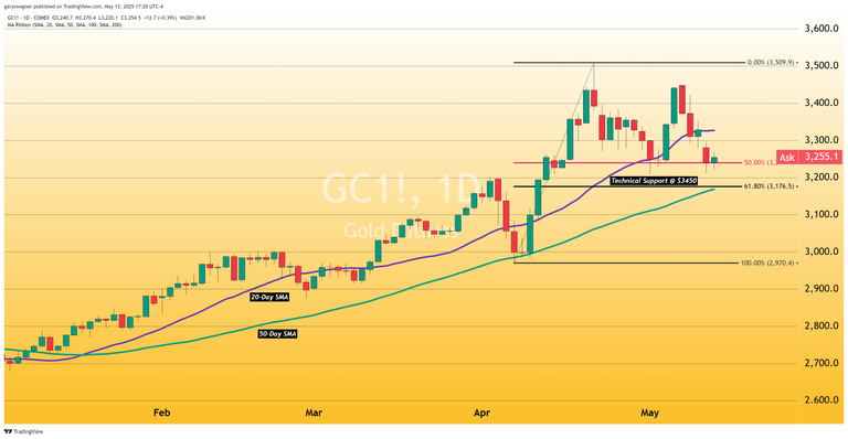 While today's modest increase offers some relief for bullion investors, it represents a mere 0.17.55 % recovery from yesterday's substantial 2.62% decline. Gold has been under pressure since last Wednesday, May 7, when June futures began a significant four-day correction that drove prices down from $3448 to yesterday’s settlement price of $3,241.80.