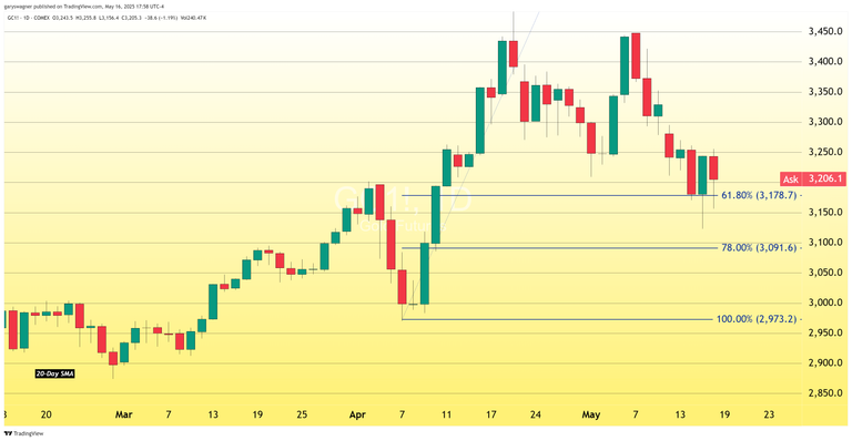 Gold futures have experienced an extraordinary retreat since May 7, declining by $242.80 to close at $3,205.30 on Friday, May 16. The June gold contract, which opened at $3,448.10 on May 7, has shed approximately 7% of its value in just eight trading sessions.