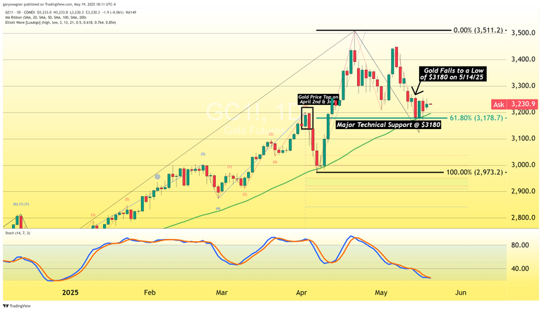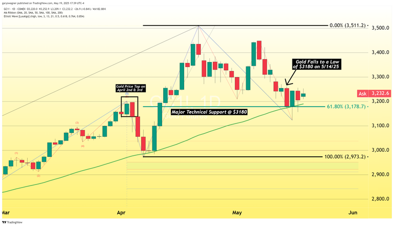 Gold futures basis the most active June 2025 contract has been able to maintain its pricing above a key level of technical support at $3180. After falling to a low of $317o on Wednesday, May 14 gold futures have been able to open and close above that key critical technical support level.