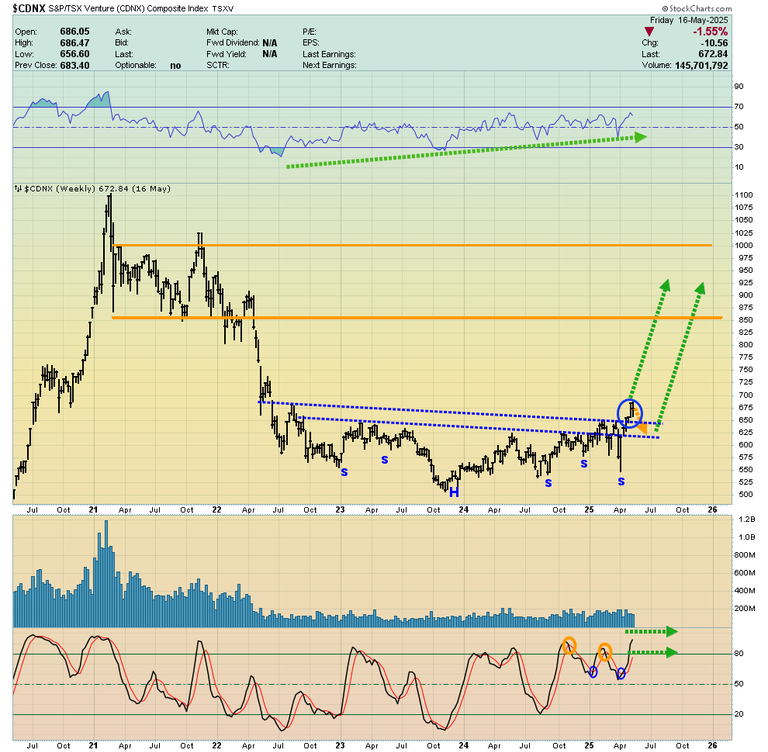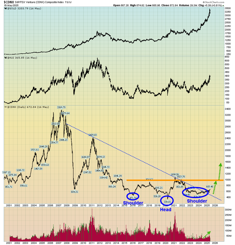 For another key look at the CDNX. A ten-year base is in play. It takes the form of a massive inverse head and shoulders pattern. Also, note the recent rise in volume. It’s subtle but positive. The CDNX low occurred at the same time (year 2020) as the rate cycle low. Clearly, the technical picture is just as bullish as the stagflation-oriented fundamentals.