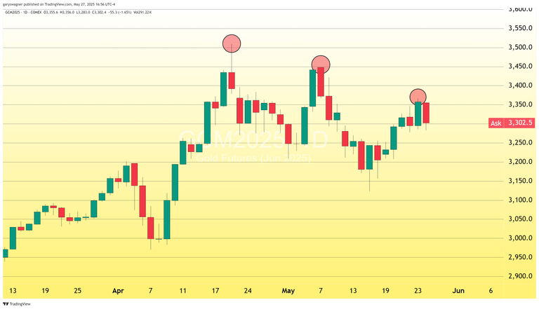From a technical perspective, gold's recent performance reveals concerning patterns for bulls. The current decline marks the third consecutive lower high since the metal reached an intraday peak above $3,500 on April 22. This pattern of diminishing rallies suggests that gold may no longer derive the same benefit from trade uncertainty that it enjoyed during the height of tensions in April.