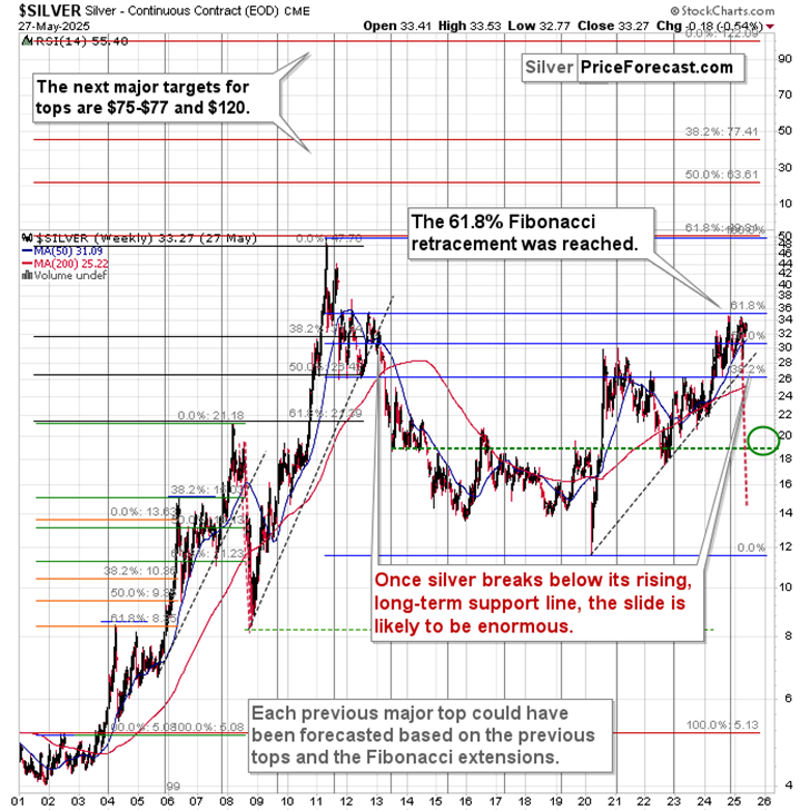 The main difference between both cases is that now silver is after a rally that’s not as steep, and it’s more vulnerable technically – it failed to rally above the 61.8% Fibonacci retracement based on the 2011 – 2020 decline. Technically, the rally from the 2020 low is just a correction of the 2011 – 2020 slide.