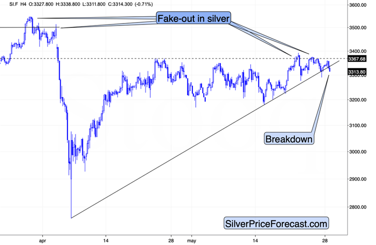 A few days ago, the breakout was immediately invalidated, but this time, silver is staying below the support line.
