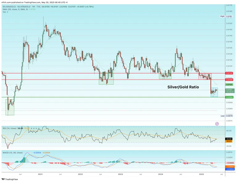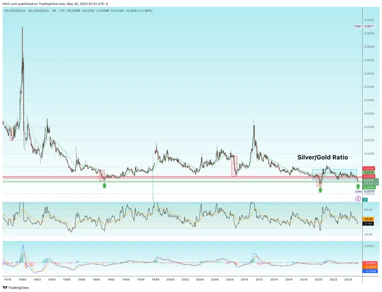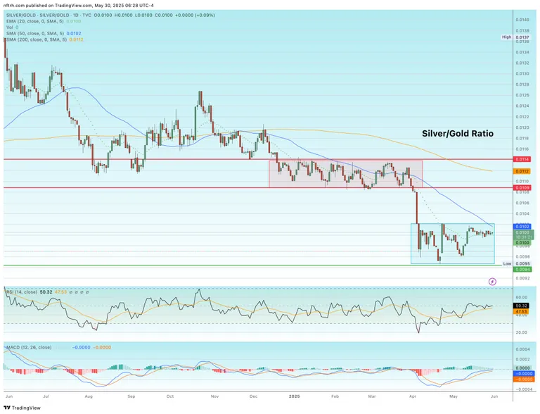 Lately silver is weak relative to gold, to the tune of an oversold reading, from which the Silver/Gold ratio is attempting a bottom as it forms a pattern with RSI and MACD diverging positively.