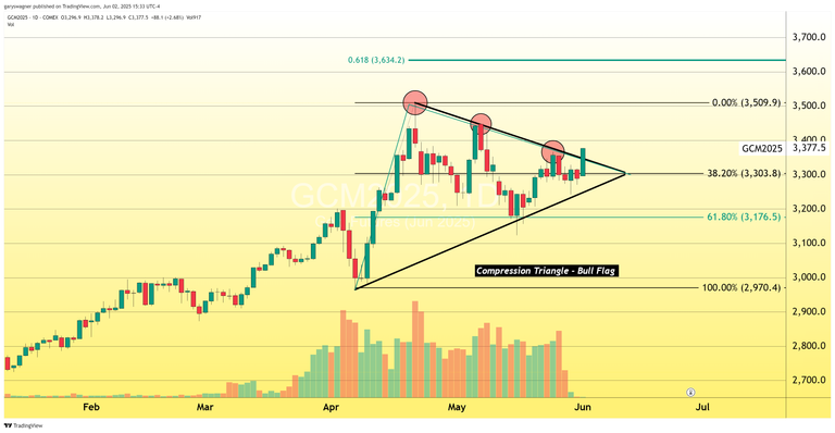 From a technical perspective, today's rally represents a significant breakout above recent resistance levels. Gold had established a pattern of declining peaks since reaching an intraday record high of $3,509 on April 22. Subsequent lower highs occurred on May 6-7 at approximately $3,447 and again on May 23 near $3,358, forming a compression triangle pattern over the past two months.