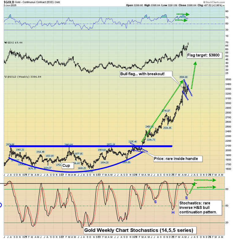 - The second item is the large inverse H&S bull continuation pattern on the key 14,5,5 series Stochastics oscillator. These patterns are rare… and incredibly bullish.