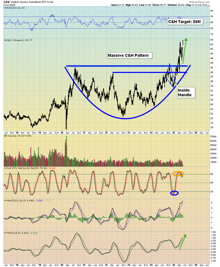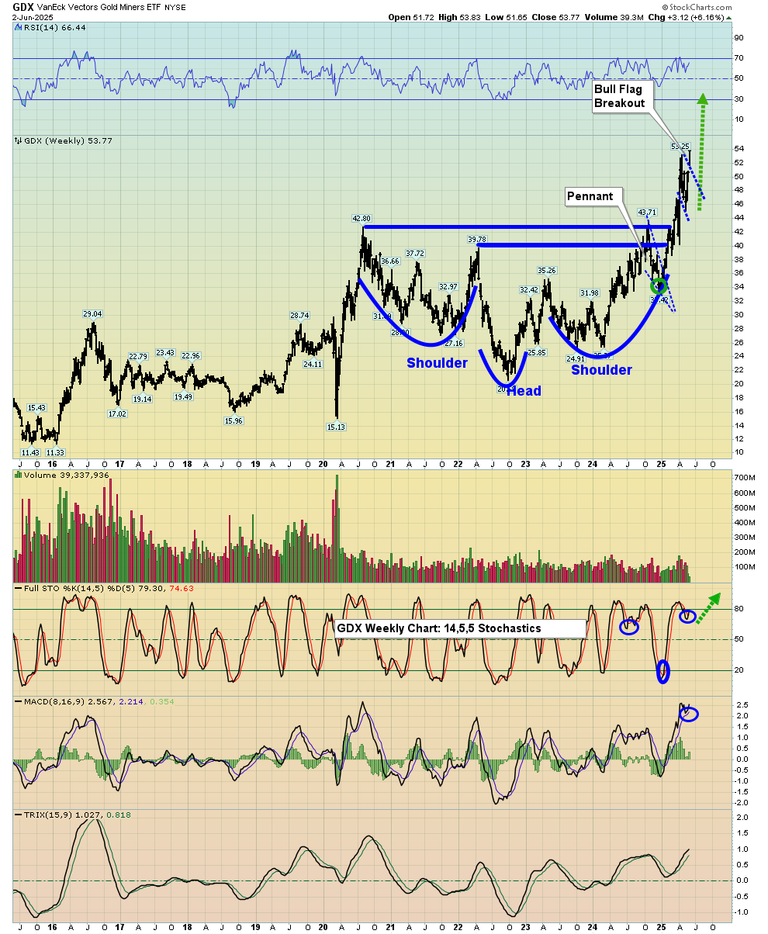 - Also, GDX sports the same rare (and incredibly bullish) inverse H&S bull continuation on the 14,5,5 Stochastics oscillator that is visible on the gold bullion chart.
