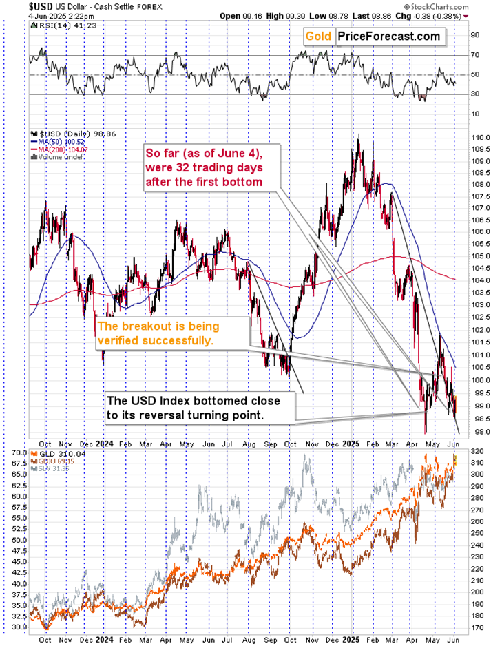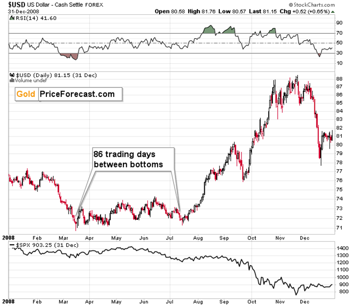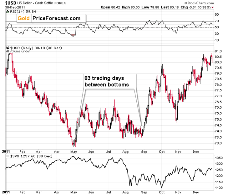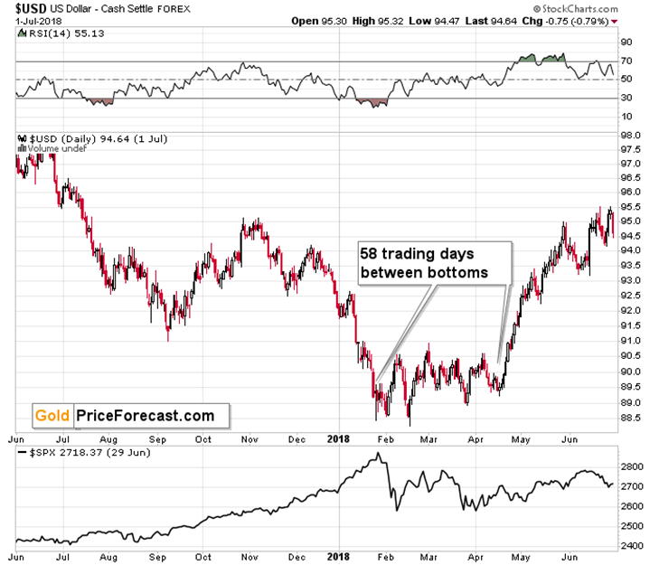 Right now, we’re 32 days after the first bottom. This is a much shorter period than in all previous cases. This, in turn, means that even if the USD Index is likely to rally from the current levels (and this very much IS the case – I view this as very likely), It might take another 18-28 trading days before the second bottom forms – this would be in perfect tune with historical norms.