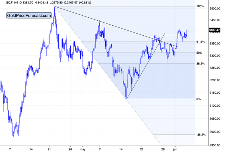 The breakout above the 61.8% Fibonacci retracement was successfully verified yesterday, so we could see another attempt to rally to $3,450 or perhaps even $3,500.